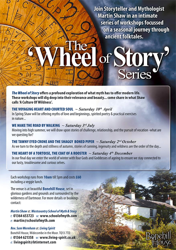 It’s just a fortnight until the next of Martin Shaw’s ‘Wheel of Story’ Storytelling Workshops. This will be our final event at Living Spirit’s current venue at beautiful Bonehill House… so let’s make it a full house and one to remember!
